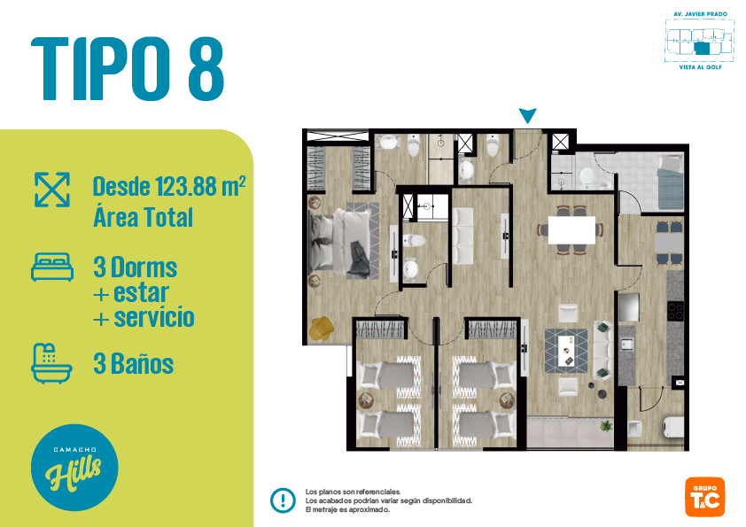 COTIZA AQUÍ Seleccione el tipo de departamento TIPO 8: 3D + ESTAR / AT: 123.88 m2 / Piso 2 - 3 TIPO 8: 3D + ESTAR / AT: 123.88 m2 / Piso 2 - 3 TIPO 10: 3D + ESTAR / AT: 125.82 m2 / Piso 2 TIPO 8 ÁREA TOTAL 123.88 m² DORMITORIOS 3 PISO 2 - 3 INFO 3D + ESTAR COTIZA AQUÍ Seleccione el tipo de departamento TIPO 8: 3D + ESTAR / AT: 123.88 m2 / Piso 2 - 3 TIPO 8: 3D + ESTAR / AT: 123.88 m2 / Piso 2 - 3 TIPO 10: 3D + ESTAR / AT: 125.82 m2 / Piso 2 He leído y acepto la Términos y condiciones y las Políticas del proyecto inmobiliario Hills Camacho. Captcha no verificado